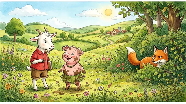 ఒక రైతు కొన్ని మేకలను, కొన్ని పందులను పెంచేవాడు. వాటిలో ఒక బుజ్జి మేక, ఒక చిన్న పందిపిల్ల ఉండేవి. బుజ్జిమేకను వాళ్ళమ్మ ఎప్పుడూ చక్కగా స్నానం చేయించి శుభ్రంగా ఉంచేది. పందిపిల్లెమో వాళ్ళమ్మతో బాటు బురదలో తిరిగేది. దాని ఒంటి నిండా బురద అంటుకునేది.