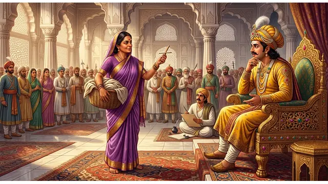 చెరువు గట్టున ఏడుస్తున్న బీర్బల్ భార్యను చూసిన రాజభటులు ఆమె దగ్గరకు వచ్చి, “అమ్మా! ఇంత అర్ధరాత్రి వేళ ఇక్కడ కూర్చుని ఎందుకు ఏడుస్తున్నావు? నీకు వచ్చిన కష్టం ఏమిటో మాకు చెప్పు” అని ఆరా తీశారు. అప్పుడు ఆమె తన కళ్లనీళ్లు తుడుచుకుంటూ, ఎంతో నేర్పుగా ఒక అబద్ధాన్ని అల్లి ఇలా చెప్పింది: “అయ్యా! మా వారికి ఇవాళ మగ బాబు పుట్టాడు. ఆ బాలింత బట్టలు తీసుకువచ్చి ఇక్కడ ఉతుకుతున్నాను, కానీ ఎంత ఉతికినా ఈ మురికి వదలడం లేదు, అందుకే బాధతో ఏడుస్తున్నాను” అని పెద్ద పెట్టున రోదించింది. మగవారు పిల్లలను కనడం ఏమిటని ఆశ్చర్యపోయిన భటులు, ఆమెకు పిచ్చి పట్టిందని భావించి లేదా ఏదో వింత జరుగుతుందని తలచి, వెంటనే ఆమెను అక్బర్ చక్రవర్తి ముందు ప్రవేశపెట్టారు.
