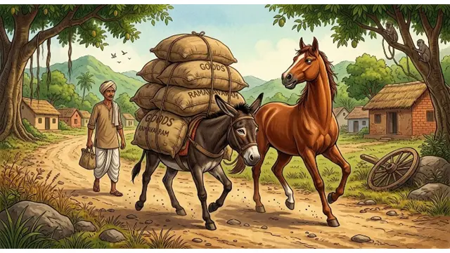 రామవరం అనే గ్రామంలో రాజయ్య అనే వ్యాపారి ఉండేవాడు. అతని వద్ద ఒక గాడిద, ఒక గుర్రం ఉండేవి. రాజయ్య తరచుగా పట్టణానికి వెళ్లి సరుకులు కొనుగోలు చేసి, ఆ బరువైన మూటలను గాడిద మీద వేసి గ్రామానికి తీసుకువచ్చేవాడు. గాడిద రోజంతా కష్టపడి బరువులు మోస్తుంటే, గుర్రానికి మాత్రం ఎలాంటి కష్టము ఉండేది కాదు; ఎందుకంటే రాజయ్య ఆరోగ్యం కోసం నడుచుకుంటూ వెళ్లేవాడు తప్ప, అత్యవసరమైతేనే గుర్రం ఎక్కేవాడు. యజమాని తనను ఎంతో గౌరవంగా చూసుకుంటున్నాడని భావించిన గుర్రం, బరువులు మోసే గాడిదను చూసి ఎప్పుడూ వెక్కిరిస్తూ ఉండేది.
