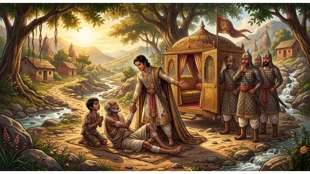 కొంత దూరం నడిచిన తర్వాత, ఆ వాగులు మరియు వంకలు దాటి రోడ్డు మీదకు చేరుకున్న యువరాజు దిలీపుడికి అక్కడ సిద్ధంగా ఉన్న రథం కనిపించింది. సాధారణంగా రాజమర్యాదల ప్రకారం యువరాజే ముందుగా రథం ఎక్కాలి, కానీ దిలీపుడు మాత్రం మానవత్వంతో ముందుగా ఆ గాయపడిన వృద్ధుడిని రథంలోకి ఎక్కించి, ఆ తర్వాత తాను ఎక్కాడు. ప్రయాణం మొదలైన వెంటనే, రథ సారథితో మాట్లాడుతూ, “మన కోట కంటే ముందే ఒక వైద్యశాల వస్తుంది కదా, ముందుగా ఈ తాతకు చికిత్స చేయిద్దాం, అటువైపే రథాన్ని పోనివ్వు” అని ఆజ్ఞాపించాడు. తన సుఖం కంటే ఒక సామాన్య పౌరుడి ప్రాణం మరియు ఆరోగ్యం ముఖ్యమని భావించిన దిలీపుడి ప్రవర్తన అతనిలోని ఉత్తమ గుణాలను ప్రతిబింబించింది.