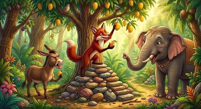 ఆ మామిడి పండ్లు చాలా ఎత్తులో ఉండటంతో నక్కకు అందలేదు. కానీ అది పట్టు వదలకుండా ఒక ఉపాయం ఆలోచించి, శ్రమించి రాళ్లను ఒకచోట చేర్చి పెద్ద రాళ్ల గుట్టను తయారు చేసింది. ఆ గుట్టపైకి ఎక్కి మామిడి పండ్లను కోసుకుని తినడం ప్రారంభించింది. ఎంతో కష్టపడి సంపాదించుకున్న ఆ పండ్లు నక్కకు ఎంతో తీయగా అనిపించాయి.