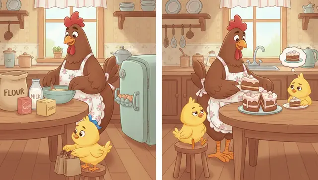 అనగనగా ఒక కష్టపడే తల్లి కోడి (Mother Hen) ఉండేది. దానికి జాకీ, జానీ అనే ఇద్దరు పిల్లలు ఉన్నారు. ఒకరోజు అమ్మ కోడి కేక్ తయారు చేయాలని నిర్ణయించుకుంది. దానికి కావలసిన పాలు, మైదా, పంచదార మరియు గుడ్లు తేవడానికి వెళ్తుంటే, జానీ సహాయం చేయడానికి ముందుకు వచ్చాడు. జానీ బరువైన సంచులను మోసి, గుడ్లను జాగ్రత్తగా ఫ్రిజ్లో పెట్టాడు. కానీ జాకీ మాత్రం కేక్ ఎప్పుడు రెడీ అవుతుందా అని ఎదురుచూస్తూ కూర్చుంది,.